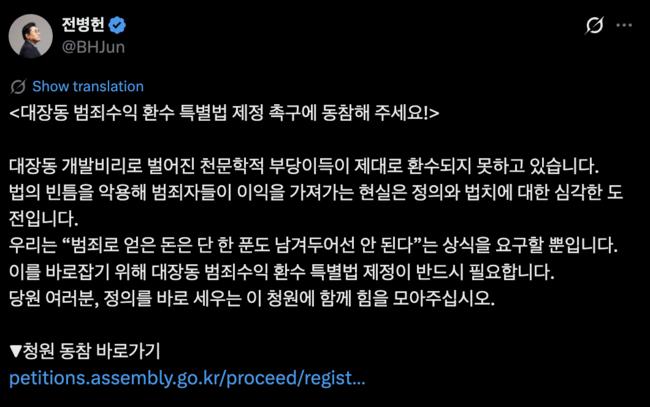 전 대표는 "법의 빈틈을 악용해 범죄자들이 천문학적 이익을 가져가는 현실은 정의와 법치에 대한 심각한 도전"이라고 규정했다. 그는 현 상황을 부당이득 환수 불능 사태로 진단하며, 당원들에게 청원 동참을 강력히 호소했다. 이는 이재명 대통령과 관련된 사법 리스크를 부각하고, 범죄 수익이 측근들에게 귀속되는 것을 막기 위한 원외 정당의 승부수로 풀이된다.