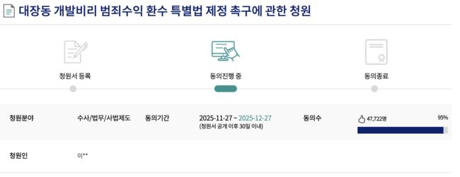 검찰의 항소 포기로 대장동 개발 비리 범죄수익 7,400억 원의 환수가 무산될 위기에 처하자, 이를 저지하기 위한 입법 청원이 국회 회부 요건인 5만 명 달성을 목전에 뒀다. 15일 기준 국회 국민동의청원 동의 수는 4만 7,000건을 넘어섰다. 청원인은 현행 법제도로는 구형액의 6% 수준인 473억 원만 환수 가능하며, 나머지 막대한 이익이 범죄자들에게 귀속되는 모순적 상황을 비판했다.