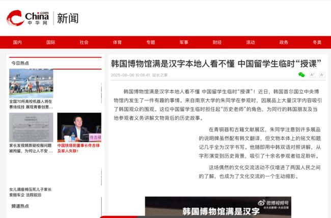 사진 : 시나닷컴 갈무리 한국박물관에 중국유학생이가면 한국인에게 교사역할을 하게 된다는 내용