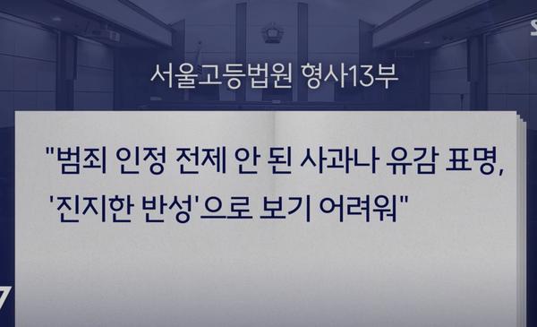 서울고등법원 형사13부의 조국에 대한 판결문 중. (사진: SBS뉴스) 광복절 특사로 풀려나자마자 사과나 자숙은 커녕 자신의 사면이 ‘검찰독재 종식’이라고 자평하는 그의 모습은 피해자 코스프레를 넘어 과도한 자기애의 극단을 보여준다. 또한 그에 대한 항소심 재판부의 판단이 얼마나 정확했는지를 증명한다. 개혁신당의 논평처럼 “사과도 반성도 없는 자를 풀어주는 사면은 국민 통합이 아니라 국민 우롱”일 뿐이다. 그의 입에서 나온 ‘반성’이라는 단어의 무게는 처음부터 진실도, 진심도 없었으며 불리한 순간들을 모면하기 위해 뱉은 깃털처럼 가벼운 말들 뿐이었다.