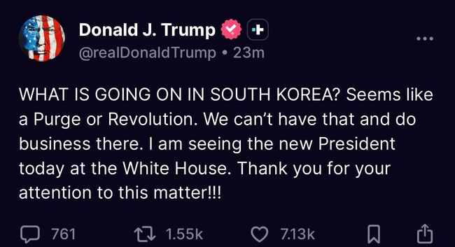 이재명 대통령과 트럼프 대통령의 한미정상회담을 앞둔 25일 한국시간 10시 경 여러 SNS에 트럼프 대통령의 메시지가 확산되었다. 트럼프 대통령이 만든 '트루스소셜'의 캡쳐본에는 'realDonaldTrump' 아이디로 "WHAT IS GOING ON IN SOUTH KOREA? Seems like a Purge or Revolution. We can't have that and do business there. I am seeing the new President today at the White House. Thank you for your attention to this matter!!!"