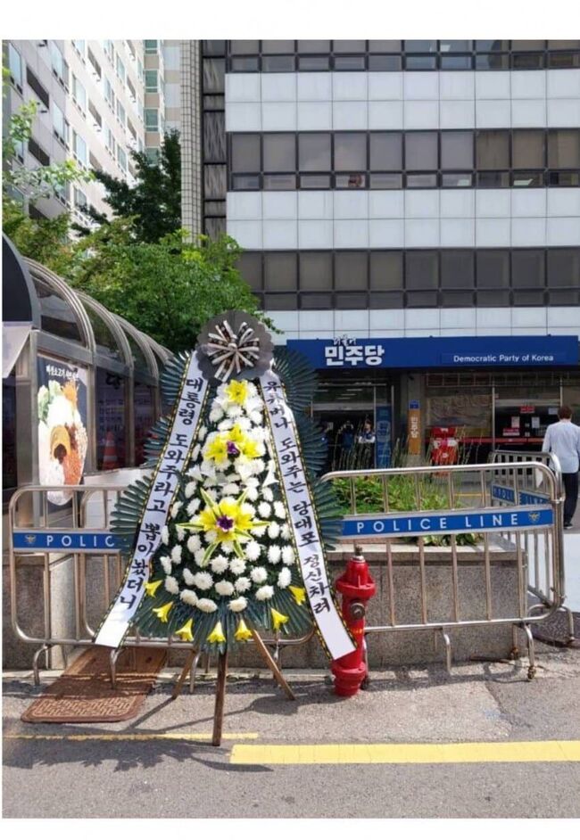 28일 더불어민주당 당사 앞에는 박찬대 의원의 지지자가 보낸 것으로 보이는 근조화환 여러 개가 도착했다.