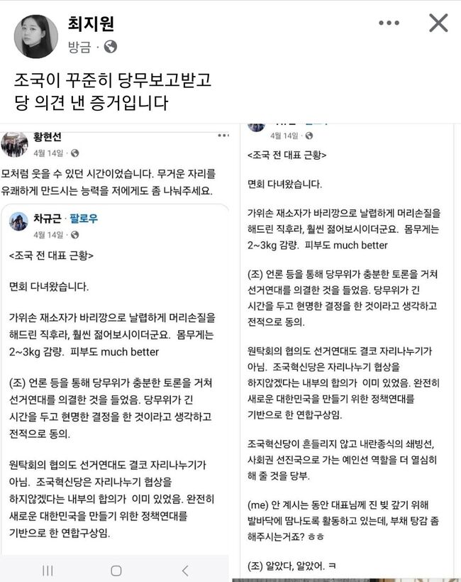 '영어의 몸' 이었기 때문에 몰랐다(김선민 당대표), '옥중정치 하지 않았다'(황현선 사무총장) 라던 조국이 옥중에서 당무를 챙긴 증거들.(사진: 최지원 페이스북)