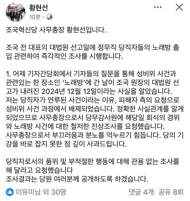 황 사무총장은 페이스북에 또 하나의 글을 올렸다. 그는 조국 전 대표의 2년 실형 확정일인 12월 12일에 당직자들이 노래방에 갔다는 것을 '기자 질의로 알았다'며, '이 사실을 뒤늦게 알게 된 점에 대해 부끄러움과 분노를 느낀다, 당의 기강을 바로잡지 못한 점에 대해 사과한다' 면서 진상조사를 하겠다고 밝혔다. 여기에서도 촛점이 벗어난 것을 느낄 수 있다. 황 사무총장은 '대표의 실형 확정 날 당직자들이 노래방에 간 것' 에 유독 분노하며 '당의 기강' 을 잡겠다고 한다. 분노의 대상이 엉뚱하다. 물론, 당대표가 감옥에 가게 된 상황에서 술 마시고 노래방에 가는 사람들의 처신도 이해하기 어렵다. 그러나 조국당에 지금 심각한 문제가 그것 뿐인가. 그가 지금 제대로 문제를 인식한다면 노래방에서 일어난 성희롱과 성추행에 강경한 입장을 밝히고 더욱 분노해야 하지 않을까?