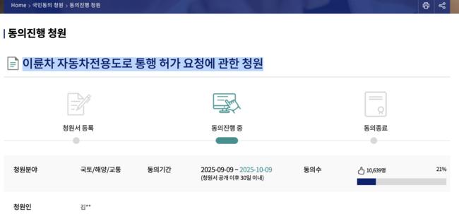이륜차의 자동차전용도로 통행 허용을 요구하는 국민청원이 개설 2주 만에 1만 명의 동의를 얻으며 빠르게 확산하고 있다.