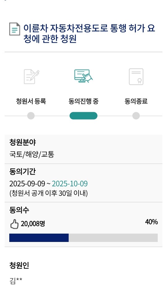 이륜차의 자동차전용도로 통행 허용을 촉구하는 국민청원이 폭발적인 속도로 확산되고 있다.