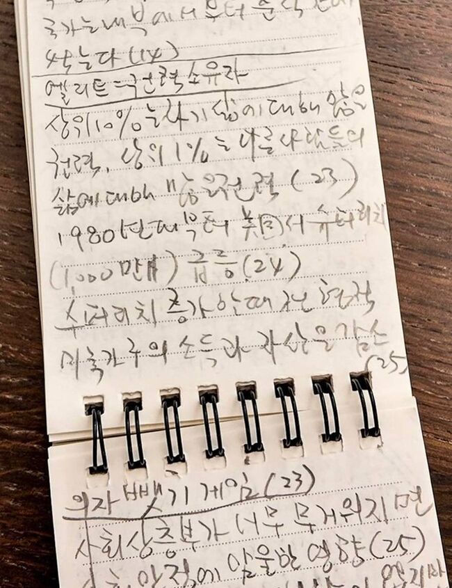 사진은 책 <폭정> 그리고 <국가는 어떻게 무너지는가> 를 소개하기 위해 메모한 그의 수첩 일부분이다. 특유의 글씨체로 요약 정리한 책의 핵심 내용이 눈에 띈다.