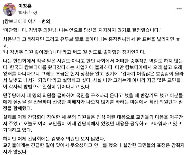 ‘미안합니다. 김병주 의원님. 나는 앞으로 당신을 지지하지 않기로 결정했습니다.’