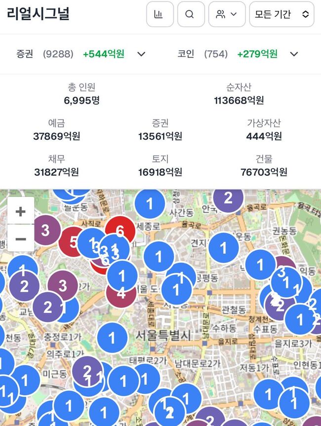 23일 엑스(구 트위터) 와 여러 커뮤니티에 따르면 이날 오후부터 ‘리얼 시그널 real-signal.org 라는 사이트를 통해 장, 차관, 용산 대통령실 1급 이상, 국회의원, 지방의원, 구청장 등 고위공직자들의 자산 상태를 이름과 종목으로 검색하면 종류별 부동산과 코인, 예금, 증권 등의 재산 현황을 한 눈에 볼 수 있다.