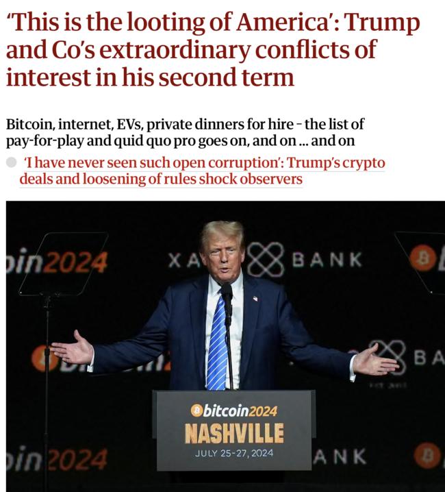 '이것은 미국에 대한 약탈이다', 트럼프 2기 정부의 이해충돌을 강도높게 비판한 가디언 기사. 트럼프 대통령과 그의 측근들이 다양한 분야에서 경제적 이득을 추구하고 있다는 내용. (사진: 가디언)