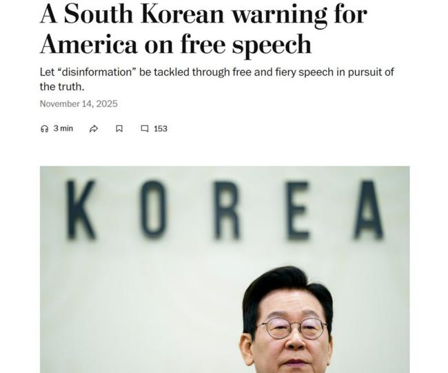 미국의 유력지 워싱턴포스트는 11월 14일 사설에서 이재명 대통령이 ‘조지 오웰의 소설에 나오는 상황’으로 한국을 끌고 가려고 하는데, 이를 자유 시민들이 따라서는 안 된다고 말했다. ‘조지 오웰의 소설에 나오는 상황(the Owellian path)’은 표현의 자유가 허용되지 않는 독재국가의 감시 체제를 의미할 것이다.