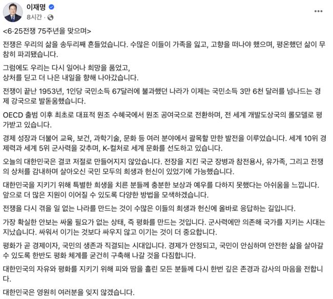 625전쟁 75주년에 군사력에만 의존하지 않겠다고 선언한 이재명 대통령 (사진=이재명 페이스북)
