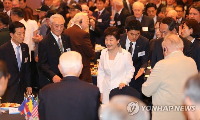 2016년 6월 24일 당시 박근혜 대통령과 한민구 국방부 장관, 박승춘 국가보훈처장이 서울 롯데호텔에서 열린 6.25전쟁 제66주년 국군 및 UN군 참전유공자 위로연에 참석하고 있다 (사진=연합뉴스)