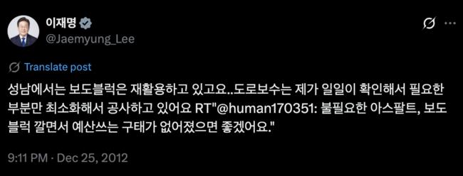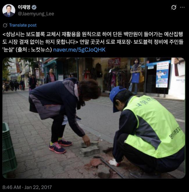 성남은 보도블럭을 재활용합니다 (이재명 대통령 SNS)