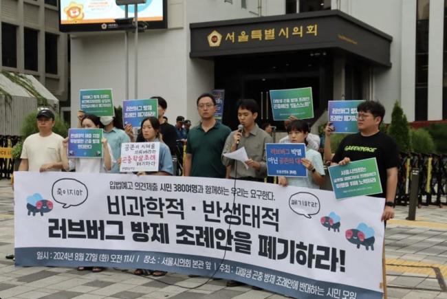 러브버그 방제 조례안을 폐기할 것을 요구하는 시민단체들 (2024년 8월, 사진=그린피스 홈페이지)