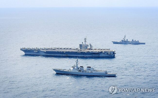 한미 해군과 일본 해상자위대가 지난 2024년 11일 제주 남방 공해상에서 북한의 핵·미사일 위협에 대한 공동 대응능력을 향상하기 위해 한미일 해상훈련을 실시하고 있다. 아래쪽부터 우리군 이지스구축함 서애류성룡함, 미국 해군 항공모함 시어도어 루즈벨트함, 일본 해상자위대 구축함 아리아케함. 2024.4.12 [해군 제공]