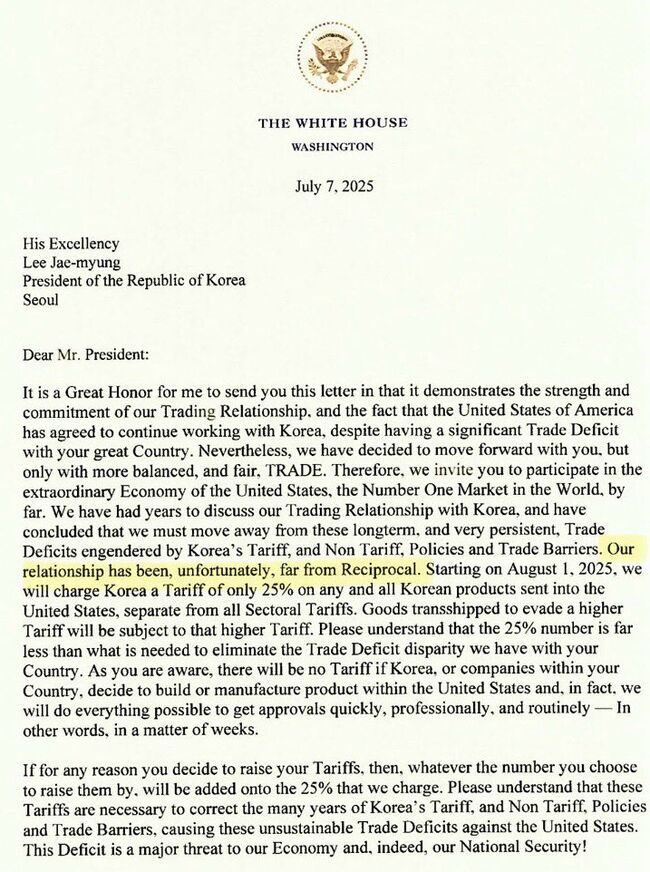 따라서 2025년 8월 1일부터, 우리는 모든 한국산 제품에 대해 25%의 관세를 부과할 것입니다. 이는 모든 부문별 관세와는 별개입니다. 더 높은 관세를 피하기 위해 환적된 상품 역시 이 높은 관세의 대상이 될 것입니다. 이 25% 관세는 우리와 귀국 간의 무역 적자 격차를 해소하기 위해 필요한 것보다 훨씬 낮은 수준임을 이해해 주시기 바랍니다.