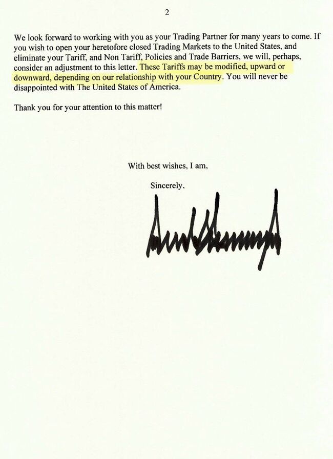 우리는 앞으로 수년간 당신의 무역 파트너로서 함께 일하기를 고대합니다. 우리는 당신이 지금까지 닫혀 있던 무역 시장을 미국에 개방하고, 당신의 관세, 비관세 정책 및 무역 장벽을 제거하기를 바랍니다. 우리는 이 서한에 따라, 아마도 귀국과의 관계에 따라 이 관세들을 상향 또는 하향으로 조정하는 것을 고려할 것입니다. 당신은 결코 미합중국에 실망하지 않을 것입니다.