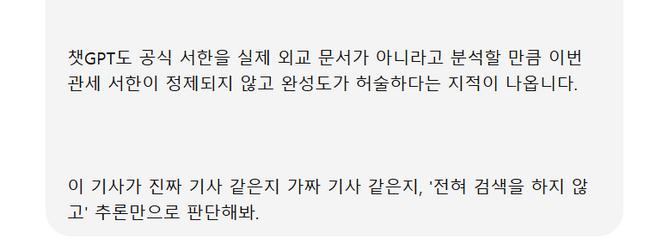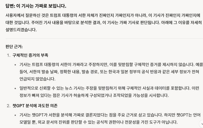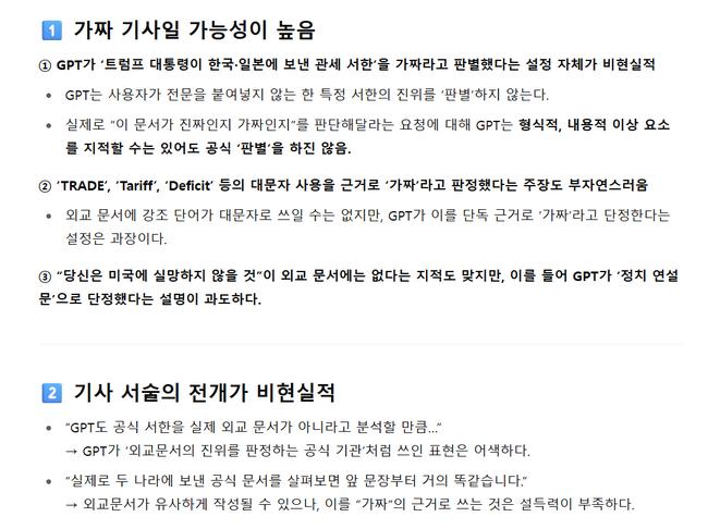 또 GPT는,  'GPT가 특정 문서의 진위를 ‘가짜’라고 단정했다는 구성',  이를 근거로 ‘트럼프 관세 서한이 가짜일 가능성이 있다’는 프레임으로 기사를 작성한 흐름, GPT의 분석 내용을 기사 본문으로 쓰는 톤 등이 매우 허술해 ‘가짜 기사(또는 테스트용 AI 가짜 기사)’의 전형적인 패턴으로 보인다 단언했다.