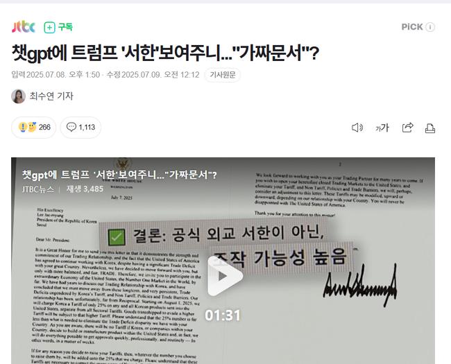 '트럼프 가짜서한' jtbc의 기사를 챗GPT에게 진짜냐 물었더니