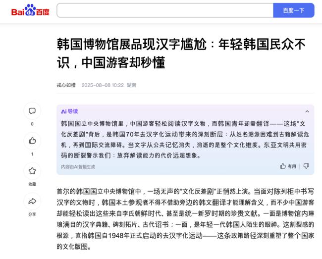 중국의 오만함과 한국을 향한 경멸은 이제 임계점을 넘고 있다. 불과 며칠 전, 시나통신(新浪通信)과 같은 중국의 대표적 매체들은 "한국인들은 자국 박물관의 한자조차 읽지 못해 중국 유학생에게 배워야 한다"는 식의 기사를 주요 뉴스로 다루었다. 이는 단순한 해프닝 보도가 아니다. "너희 문화의 뿌리는 우리인데, 그 근본조차 잊어버린 한심한 민족"이라는 문화적 우월감과 조롱을 노골적으로 드러낸 것이다. 고구려사를 빼앗으려는 '동북공정'과 김치, 한복을 자기 것이라 우기는 '문화 공정'의 연장선상에서, 한국의 정체성을 뿌리부터 흔들려는 교묘한 여론전이다.