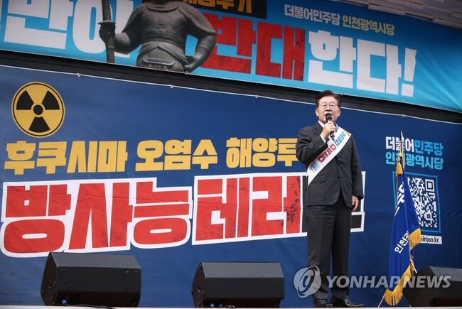 2023년 6월 17일 당시 더불어민주당 이재명 대표가 일본 후쿠시마 오염수 방류 규탄대회에서 발언하고 있다.(사진=연합뉴스)