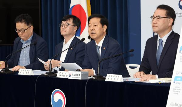 구윤철 부총리 겸 기획재정부 장관(오른쪽 두번째)이 지난 28일 정부세종청사 중앙동 공용브리핑실에서 2026년도 예산안에 관해 설명하고 있다. [연합뉴스]
