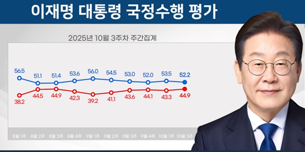 리얼미터가 에너지경제신문 의뢰로 10월 13일부터 17일까지 전국 유권자 2518명을 대상으로 조사한 결과, 이재명 대통령의 국정 수행 긍정 평가는 52.2%로 나타났다. 이는 2주 전 조사보다 1.3%포인트 하락한 수치다. 부정 평가는 44.9%로 1.6%포인트 상승했다. 연령별 긍정 평가는 40대(64.8%)와 50대(64.5%)에서 높았으나, 18~29세에서는 31.8%에 그쳤다. 지역별로는 호남권(74.4%)에서 가장 높은 지지율을 보였고, 대구·경북(35.0%)과 강원(36.9%)에서는 상대적으로 낮았다.
