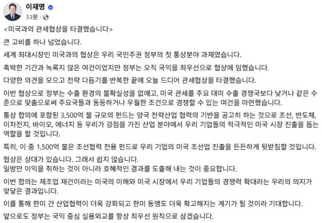7월 31일 이재명 대통령의 페이스북에 올라온 첫 번째 관세협상 타결 (이재명 대통령 페이스북 갈무리)