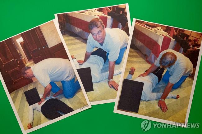 엡스틴 파일 공개에 포함된 앤드류 왕자의 사진. 바닥에 누워있는 여성을 내려다보는 앤드류 왕자. 그는 2022년 엡스틴 연루 건으로 왕실직위를 박탈당했다. (사진: 연합뉴스)