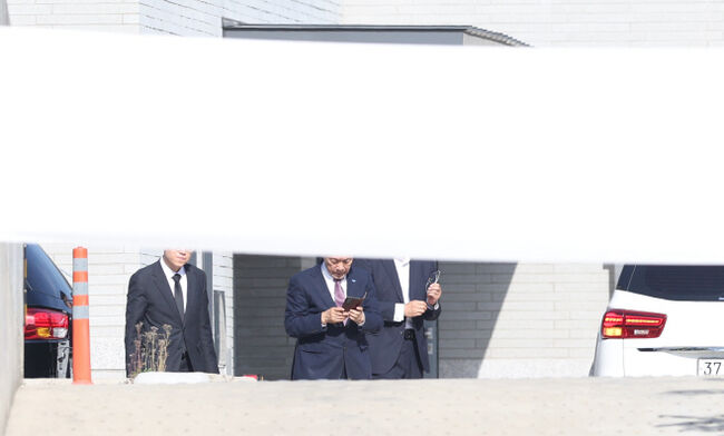 국민의힘 황우여 비상대책위원장이 경남 양산시 하북면 평산마을 문재인 전 대통령 사저에서 도착해 휴대전화를 보며 이동하고 있다. (사진=연합뉴스)