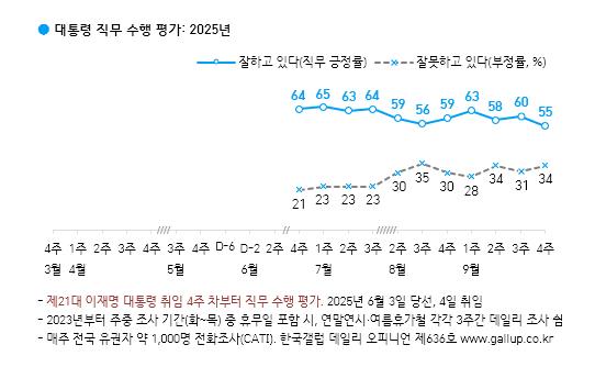 [한국갤럽] 李 지지율 55%로 5%p 하락 / 여당도 3%p 하락